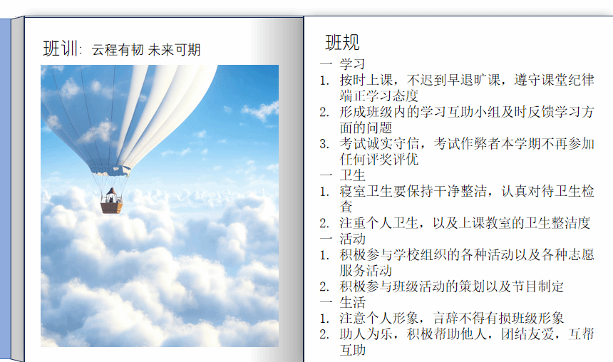 各班级广纳集体意见,制定出符合班级风格的班训、班级公约,班级同学通过班委会拟定初稿、分析校规校纪、召开班会宣讲展示、全班员工投票定稿等方式进行了参与。2023级应用统计学班班训为云程有韧,未来可期,制定的班级公约涵盖了课堂纪律、寝室卫生、同学日常相处等多个方面,内容详细具体,覆盖面广。