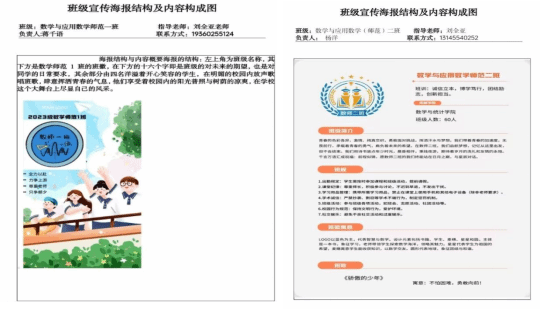 班级海报设计作为新生班级文化系列活动之一,需要班级同学集思广益,合理分工,设计出能凝练专业特色,展示班级风格的宣传海报。在班级海报展示中,应用统计学专业班徽以蓝色为主色调,展现出统计专业的严谨;经济统计学专业班徽选用了蓝色、绿色、橙色,展示出学科的活力和创新;数学与应用数学专业采用书籍、员工、麦穗、星星、圆为主要设计元素,展现出师范专业特色。