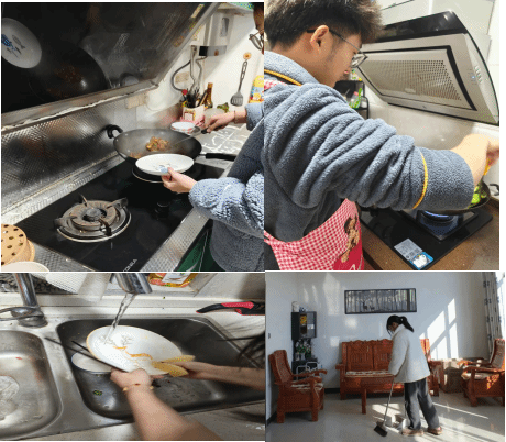 围绕“劳动青春最美丽”主题,同学们开展了家庭劳动、社区劳动等劳动实践。同学们主动和家人一起进行腊月除尘活动,在除夕当天贴春联、做年夜饭,和父母一起包饺子。曾祥锐、陈诺、王慧、徐欣雨等同学还学习厨艺,假期为家人做饭,即培养自身的生活技能,又分担父母事务。王淳、卫志兴、李晓悦等人参与父母的工作,做一些力所能及的工作,帮助父母搬运货物、售货等。在劳动中,培养了同学们的劳动习惯,促进自身德智体美劳全面发展。