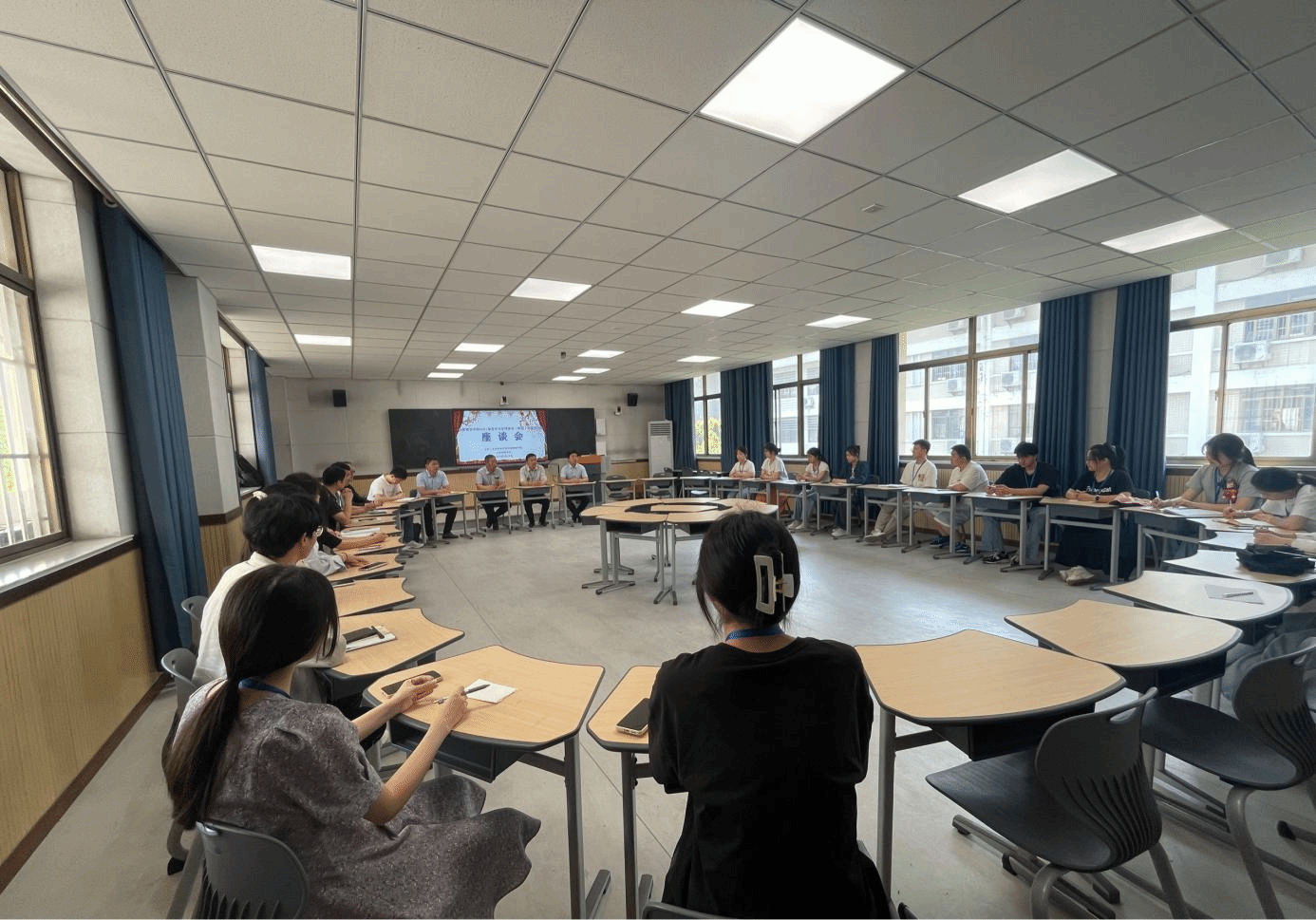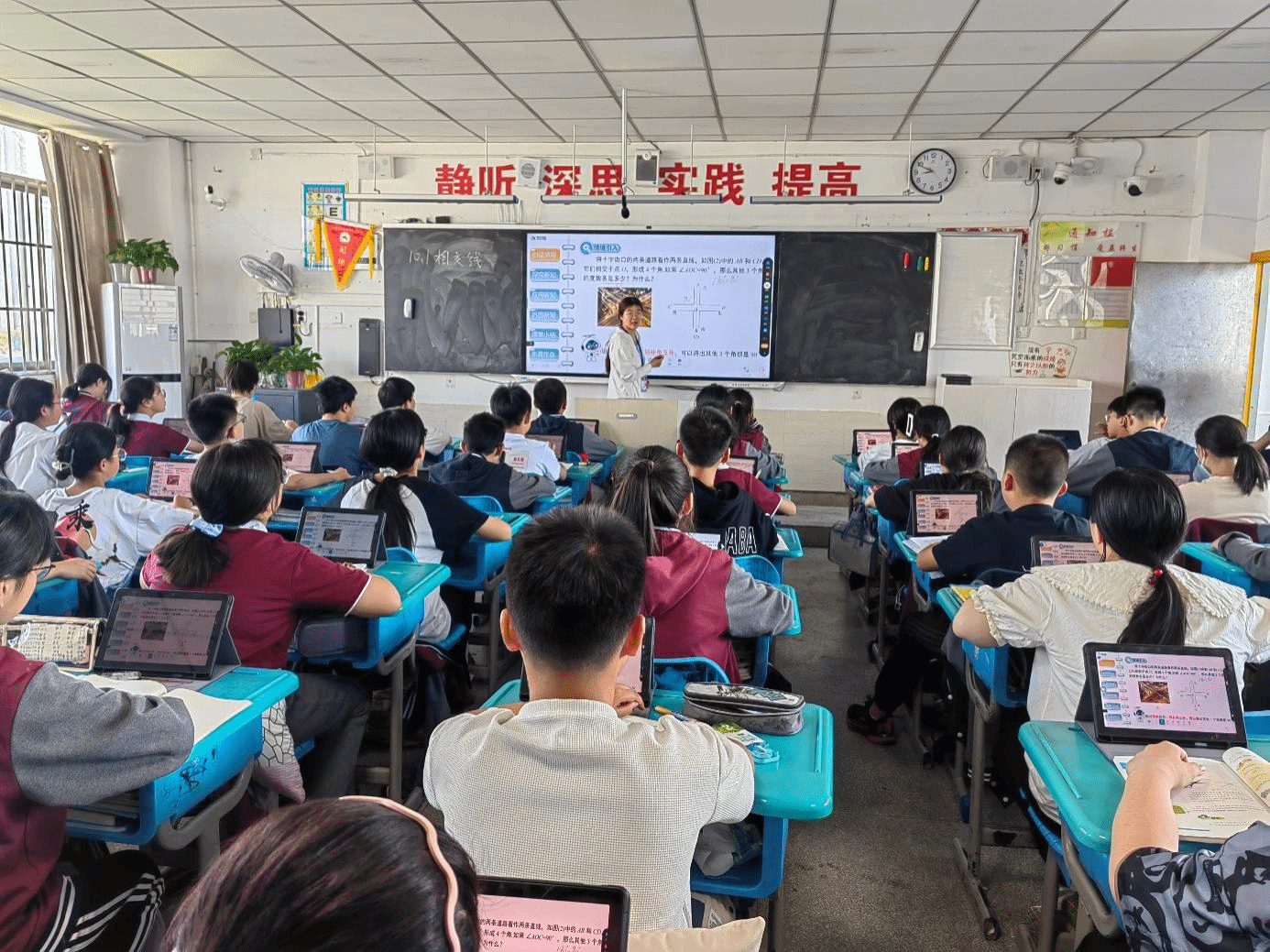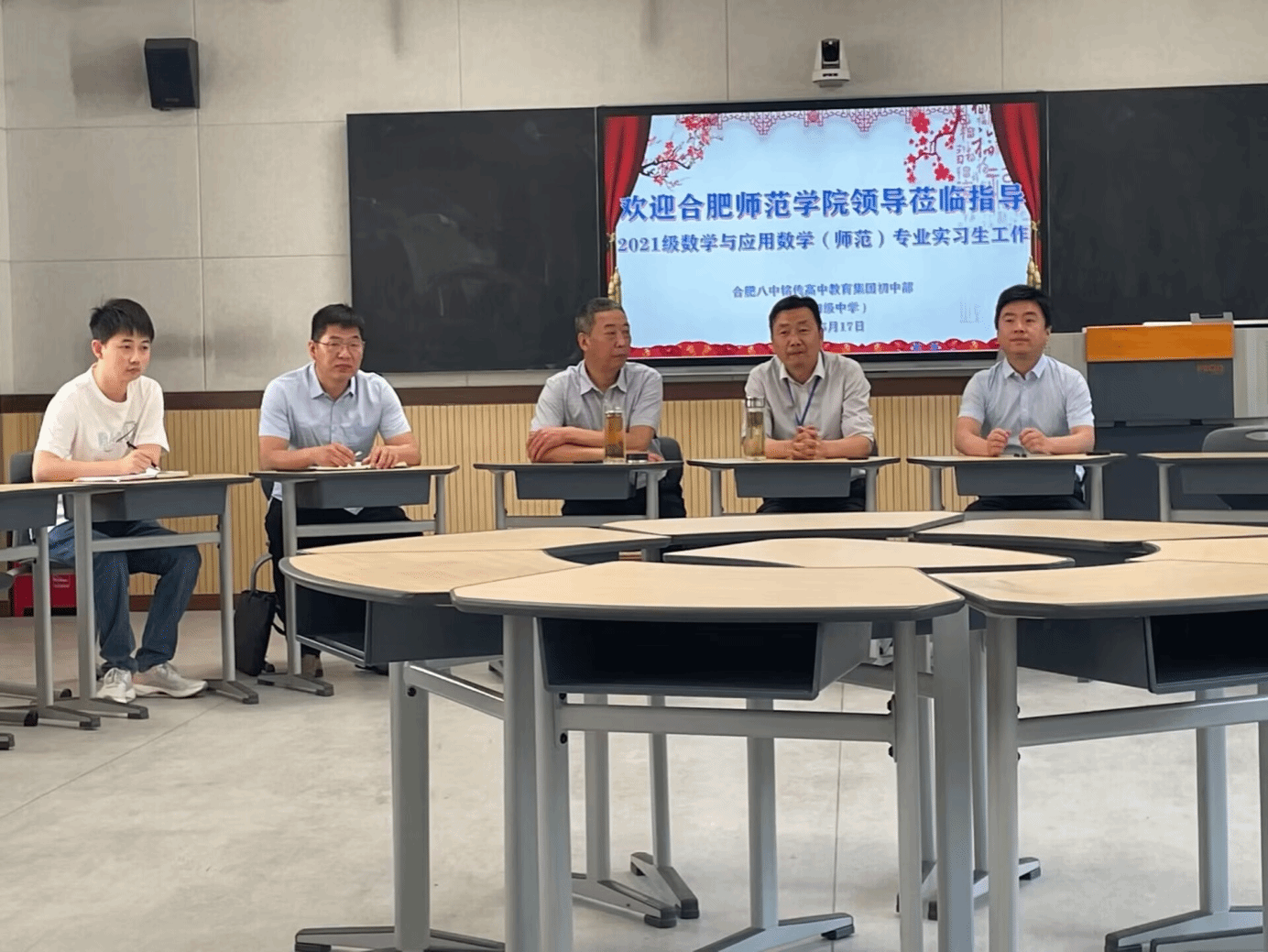 肥西上派初级中学党委书记汪东、教导处主任周稳热情接待了公司一行,并共同听了2021级数学与应用数学专业曹桠菲同学上的公开课《相交线》,课后召开了实习生座谈会。
