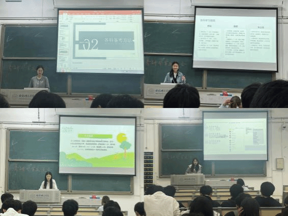 分享会中,梁婧怡和韩倩文着重提醒同学们要有自己的学习节奏与方法,保持良好心态。宋欣玥和韩宇围强调要结合职业规划和自身实力科学地选择目标院校,鼓励同学们坚定信心、打牢基础、充分发挥自己的潜能。此外,张晓珂和陈露露同学特别强调要及时关注研招网和报考院校官网以减少信息差。杨雨洁和孙梦悦则强调了合理的复习计划需精确到每日、每周,保障学习进度有序推进,并指出学习时长不等于效率,要避免疲劳战,追求高效学习。在心态调节上,张涵和李娜建议同学们备考期间要劳逸结合,适当通过体育锻炼和娱乐活动舒缓压力。