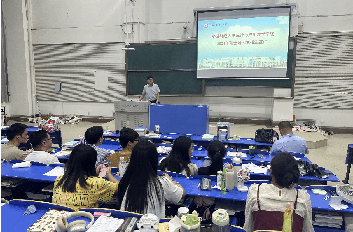 本网讯 9月15日,在逸夫楼西阶1教室,安徽财经大学统计与应用数学公司教授孙欣和李旭辉、副教授李琴和张伟一行来公司开展研究生招生宣传。公司副经理杨刘、统计系主任杨海蓉、教师宋雅晴接待并出席宣讲会。公司数学与应用数学、经济统计学、应用统计学、金融工程专业100余名高年级员工参加。
