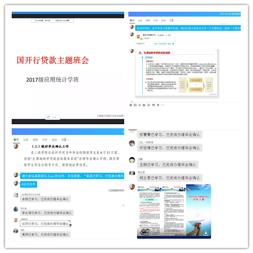 组织召开毕业班线上主题班会。鉴于目前毕业班员工多数在校外就业的情况,毕业班通过班级QQ工作群召开线上主题班会。班会上各毕业班辅导员按照要求主要落实了以下三项工作。一是上好资助政策“两节课”。针对直接就业的获贷毕业生,上好毕业确认流程讲解课,对毕业确认、提前还款办理、就学信息变更办理还款流程等进行详细讲解。针对继续攻读学位的获贷毕业生,上好下一学段资助政策宣讲课,解决了家庭经济困难员工进入下一阶段学习的后顾之忧。二是会上各毕业班辅导员组织员工自行观看了助学贷款宣传片、宣传手册PPT等,引导员工更加了解国家资助政策。三是通过召开诚信主题班会,提高员工对诚信感恩、责任担当的理解和认识,引导员工树立诚信和自立自强意识,增强责任担当。