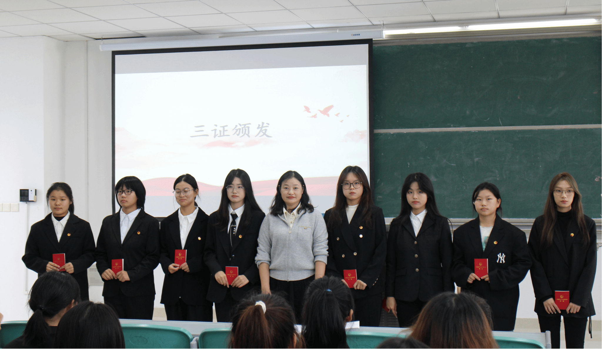 穆娟为新团员颁发了“三证”,对全体新生团员表示热烈的祝贺,对所有在团组织中默默付出、辛勤工作的团员们表示鼓励。她强调了加入共青团的重要性和意义,对新团员提出三点期望:一是希望同学们坚定理想信念,始终坚守对马克思主义的崇高信仰、坚定对社会主义和共产主义的理想信念。只有坚定理想信念,才能不迷失方向,不畏惧困难,勇往直前!二是希望同学们勤奋学习,不断提高自己的综合素质。珍惜时光,努力学习科学文化知识,掌握专业技能,为未来打下坚实基础。三是希望同学们勇于实践,积极投身社会实践和志愿服务活动。在实践中增长才干,锤炼品格。