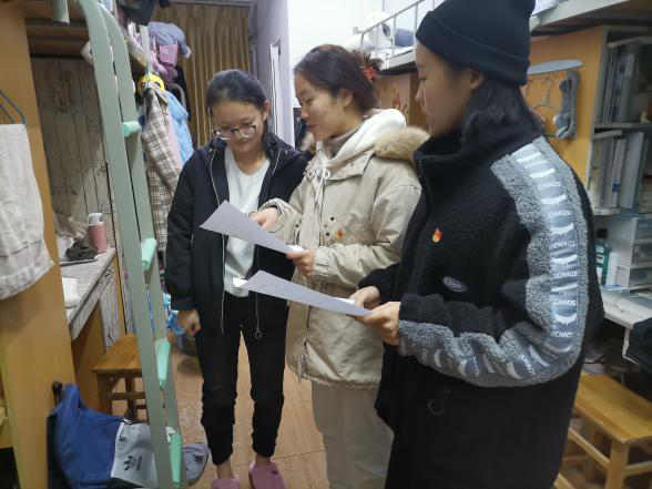 公司党委书记郑支农和辅导员们也对各寝室开展了走访。郑支农关切地询问员工们的生活起居,尤其关心大一新生的适应问题。她提醒同学们,冬季到来,做好防护保暖的同时,一定要把安全放在第一位,杜绝大功率电器,营造一个安全健康的学习生活环境。