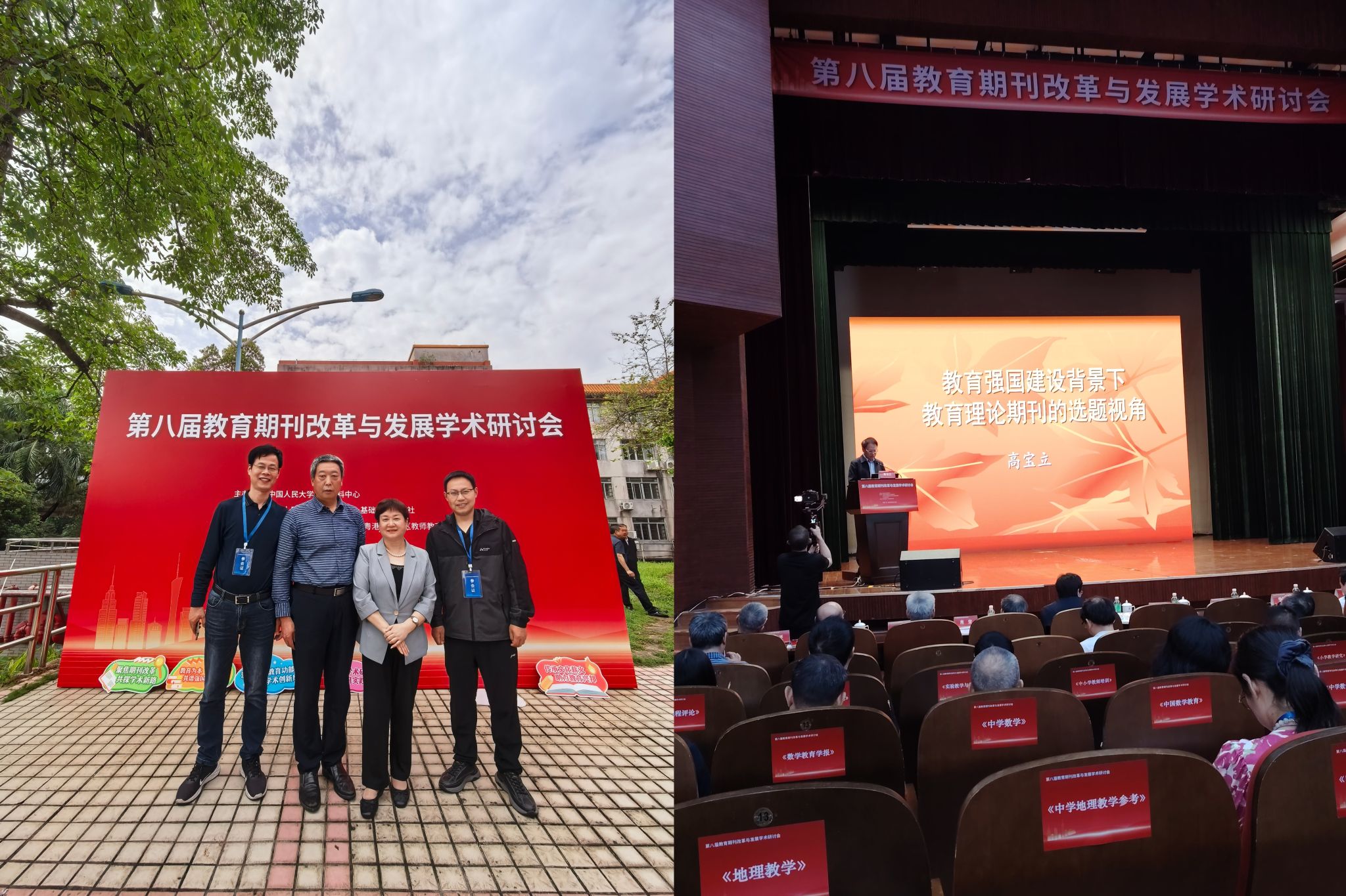 5月11-12日,由中国人民大学书报资料中心主办的第八届教育期刊改革与发展学术研讨会在华南师范大学成功举办。来自全国各地的教育期刊界专家学者、主编及资深编辑200余人齐聚一堂,围绕"教育强国建设背景下教育期刊的创新发展"主题展开深入研讨。《中学数学教学》杂志主编张新全教授、副主编王文教授及潘根安编辑应邀出席本次学术盛会。