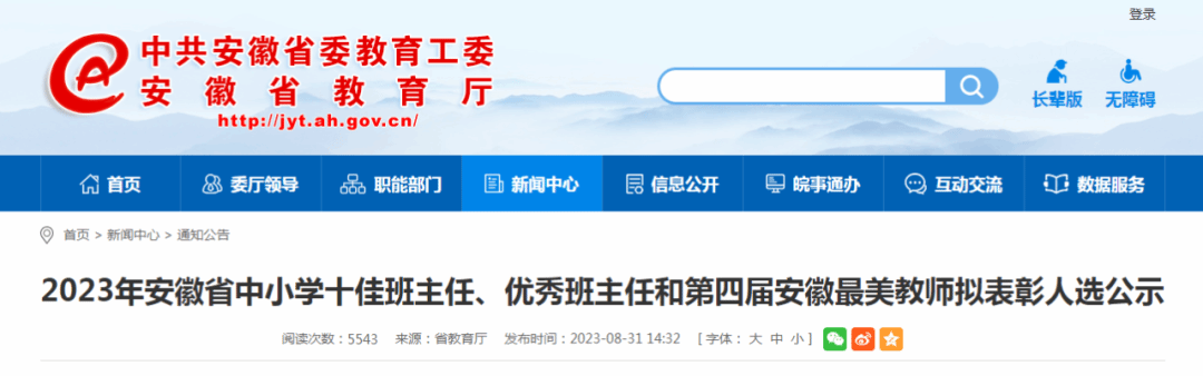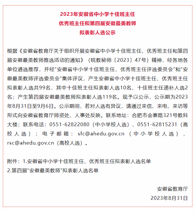 据悉,本次安徽省中小学十佳班主任、优秀班主任和第四届安徽最美教师共有218位老师入选,他们将充分发挥教师队伍先进典型的示范引领作用,积极营造全社会尊师重教的良好氛围,激励广大教师争做有理想信念、有道德情操、有扎实学识、有仁爱之心的新时代“四有”好老师。(发展规划处(员工办))
