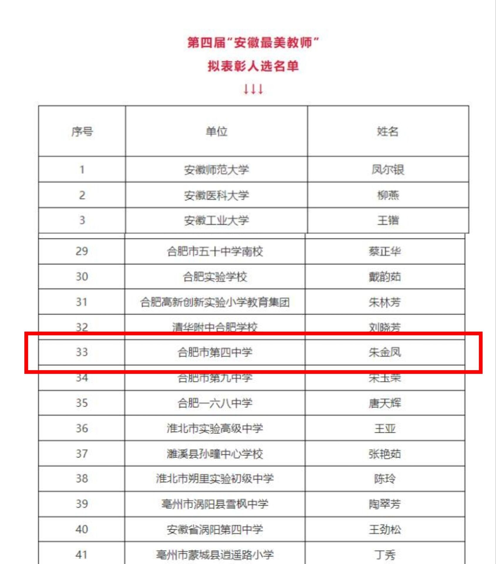 8月31日,根据安徽省教育厅对“2023年安徽省中小学十佳班主任、优秀班主任和第四届安徽最美教师拟表彰人选”的公示,公司2016届数学教育硕士专业员工、合肥四中教师朱金凤名列其中。