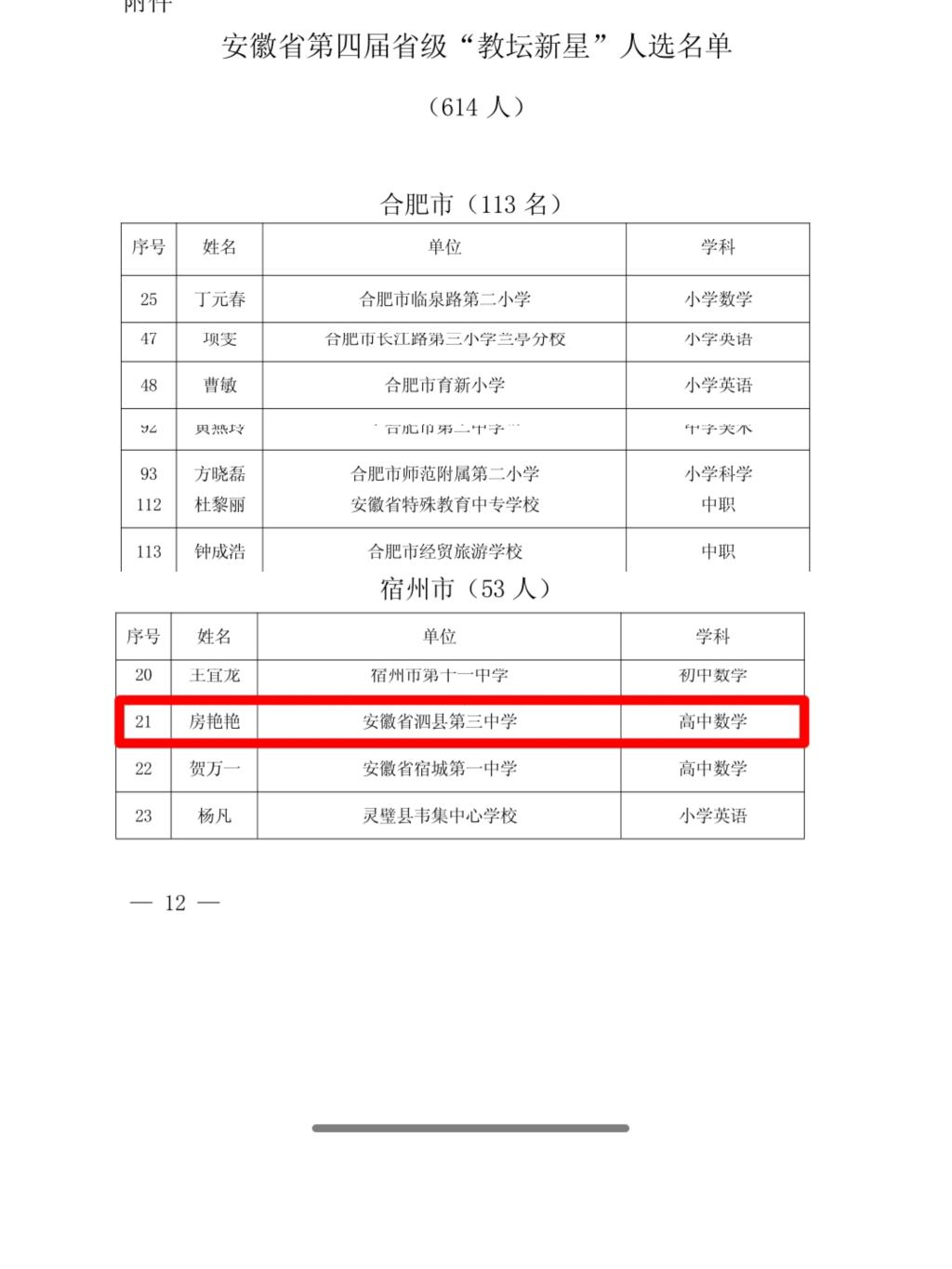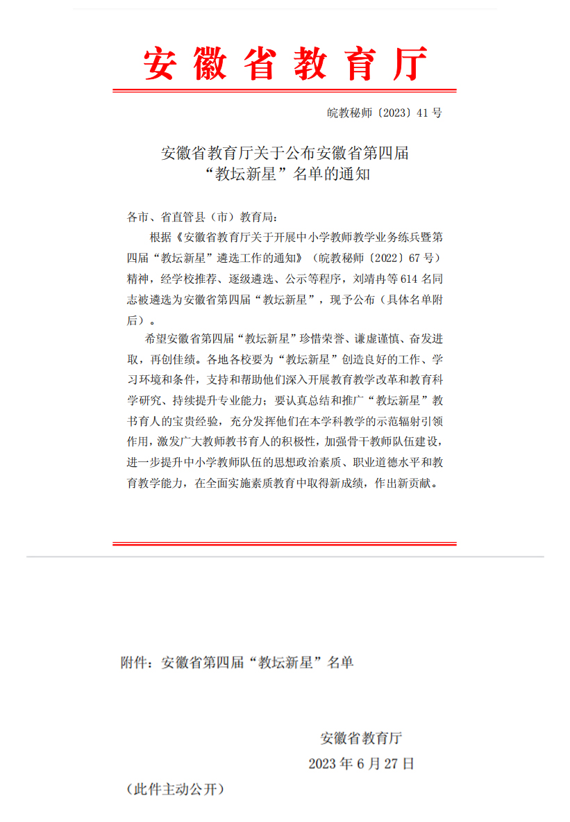 6月27日,安徽省教育厅发布文件《安徽省教育厅关于发布安徽省第四届“教坛新星”名星的通知》,公布了评选出的第四届省级教坛新星名单,公司2010届数学与应用数学专业员工、宿州市泗县三中教师房艳艳名列其中。