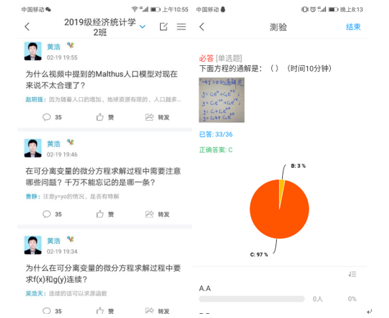 二是创新线上教学方式方法。从员工认知规律和接受特点出发,经过不断地摸索、学习和实践,最终我选定了综合运用ZOOM和学习通两个平台进行直播与互动,再结合数学学科需要较多推理运算的特点,又辅以ipad-Pencil手写功能进行在线板书,基本可以解决师生无法“面对面”的问题,实现线上学习与线下课堂教学实质等效。每次直播前,我会留足时间让员工完成学习通上布置的任务点,引导员工自主学习,基本知识点经过吸收内化后,每位员工再将自己的疑问一一记录下来,提交给学习委员进行汇总分类交给我。直播时,我会先借助ZOOM的屏幕分享功能将电子书和整个板书过程展现给员工,讲解每次课的重难点并答疑,让员工仿佛置身于课堂之中,再利用学习通与同学们互动讨论、测验、提问,以巩固所学知识。通过ZOOM视频可以随时查看每一位同学的实时画面,起到一定的监控作用。每次讨论、测验、提问的问题都是经过精心设计的,以强化员工对每节重难点内容的记忆、理解和应用。直播的效果也得到了同学们的一致好评。