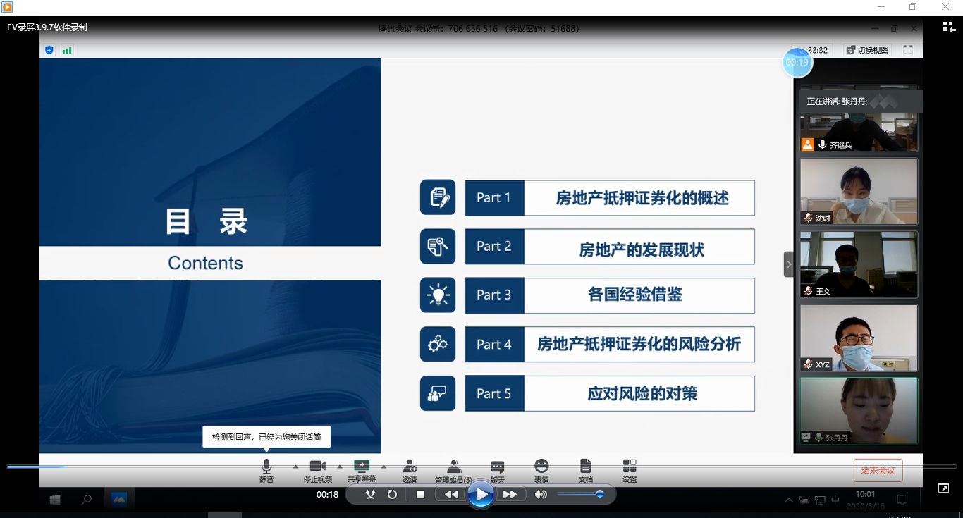 2016级金融工程班共有53名同学,其中19名同学具备免答辩资格,此次答辩共有31名同学参加。本次毕业论文答辩运用“腾讯会议”平台开展,员工在线进行答辩,答辩小组教师在办公室在线点评。答辩员工按顺序依次进入会议,通过“共享屏幕”进行PPT答辩陈述,陈述结束后答辩组教师分别进行提问与点评。同学答辩结束离开会议平台,答辩小组教师评定成绩后,在答辩小组QQ群内通知下一位同学进入会议,依次有序进行答辩。