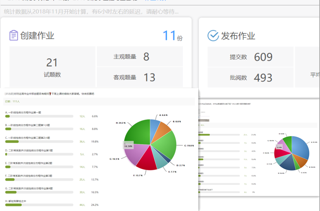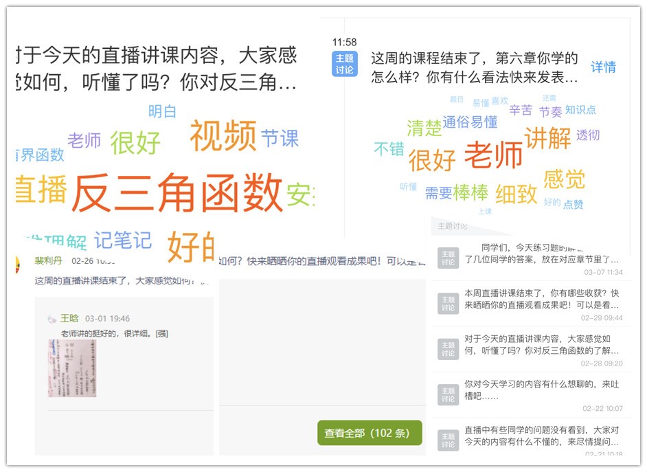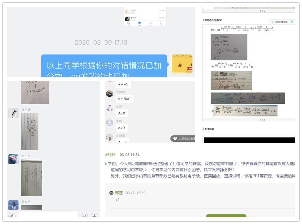 高等数学有很多需要计算及员工练习的内容,为方便员工学习。在直播中我会将所学内容详细写成讲稿,并且每次课后将讲稿整理成电子文档,与直播回放资源一起上传至学习通平台供员工复习巩固使用。在学习通平台建立各章节以“教材电子版+PPT+直播回放+直播授课讲稿”为主的四大教学资源,辅以“测验+作业+问卷+讨论”及时了解并反馈员工疑难知识点,员工的学习任务普遍完成不错。
