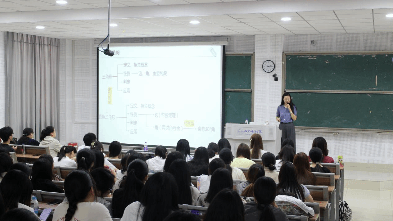 刘清清首先结合自己丰富的一线教学经历和教学竞赛经验,从《义务教育数学课程标准》(2022版)入手,围绕备课标、备教材、备学情、备教师、备教法学法等多个角度分享了如何备好一节课以及如何进行教学设计。随后,她为员工们上了一堂题为“锐角的三角函数”的精彩示范课。这堂课以巧妙的情境引入、亲切的语言表达、流畅的教学过程、精妙的教学设计以及整洁美观的板书,赢得了在场师生们的一致赞誉。