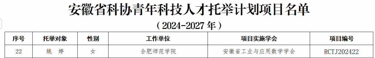 近日,安徽省科协公布了安徽省科协青年科技人才托举计划(2024-2027)入选者名单,WilliamHill中文官方网站青年教师姚婷成功入选。