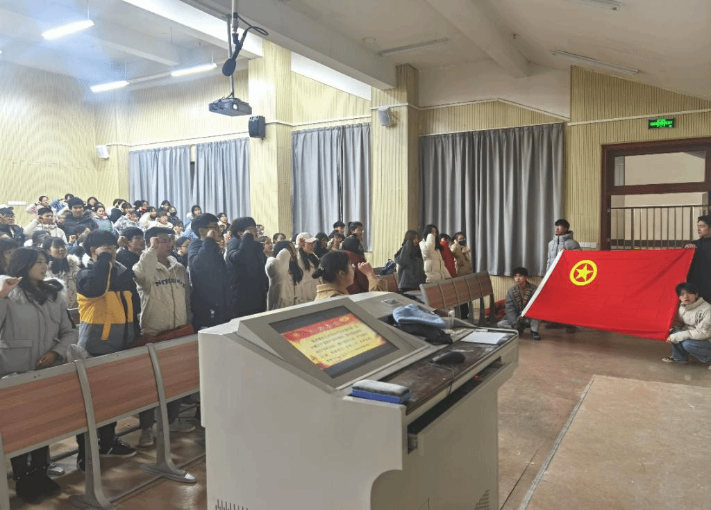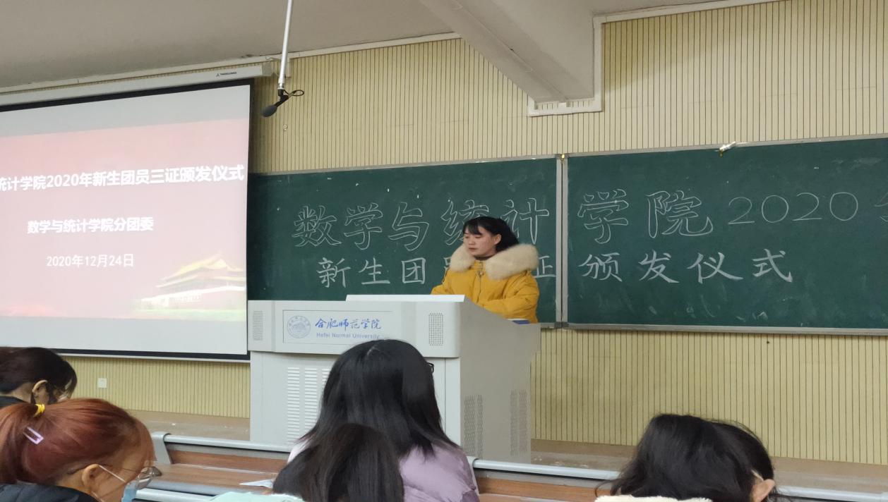 本网讯 为充分发挥共青团的先锋模范作用,进一步增强青年团员的进取意识,让青年团员进一步端正入团动机。WilliamHill中文官方网站分团委于12月24日在滨湖校区铭传楼A101举行WilliamHill中文官方网站2020年新生团员团徽、团章和团员证三证颁发仪式,2020级全体团员参与此次会议。