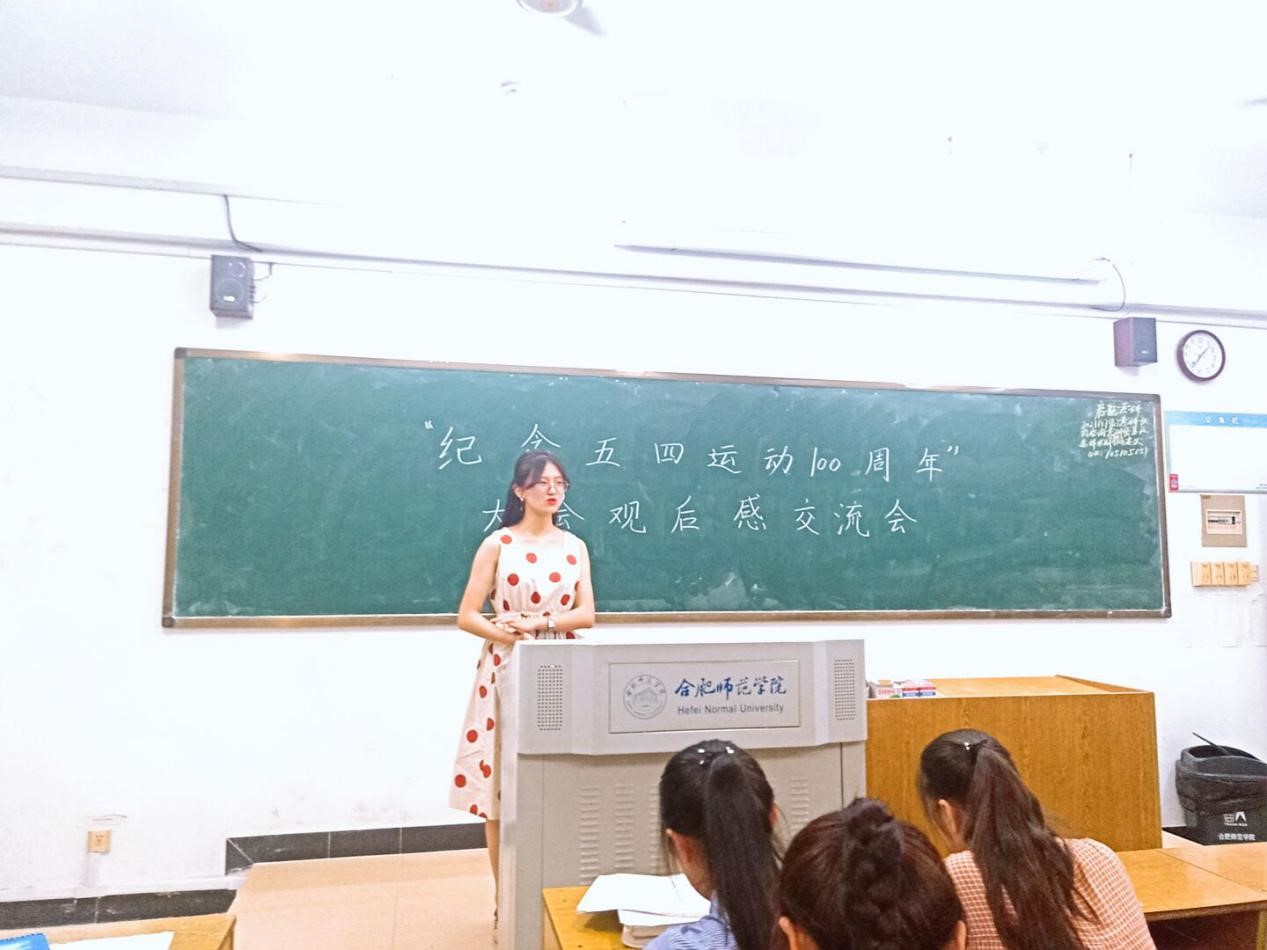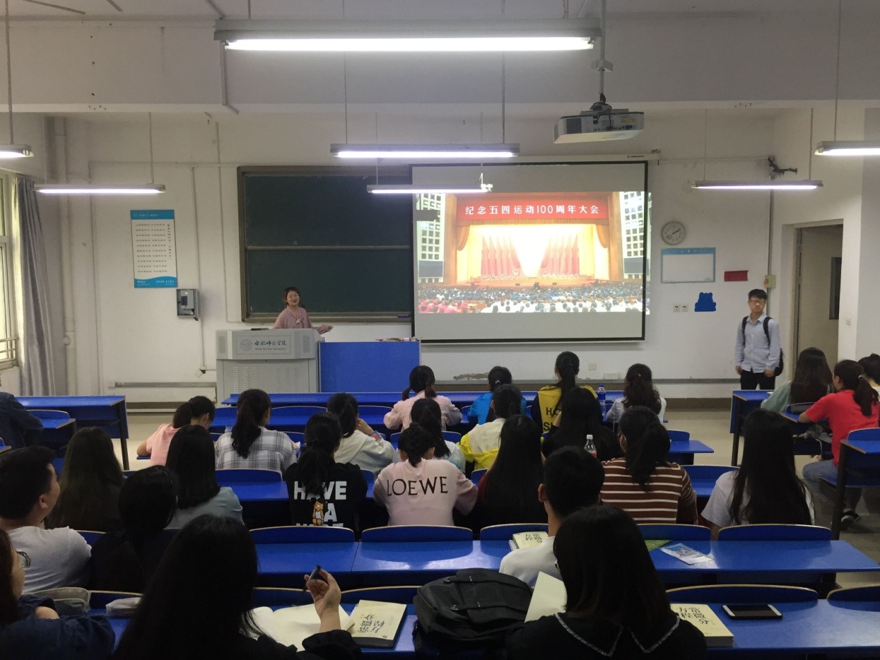 5月15日,2017级数学与应用数学师范二班团支部在逸夫楼107召开了“纪念五四运动100周年”主题班会。团支书刘美娜结合制作的PPT回顾了五四运动的历史背景,全体同学再次重温了习近平总书记在纪念五四运动100周年大会上的重要讲话视频,观看结束后,同学们纷纷发言讨论、交流了心得体会。