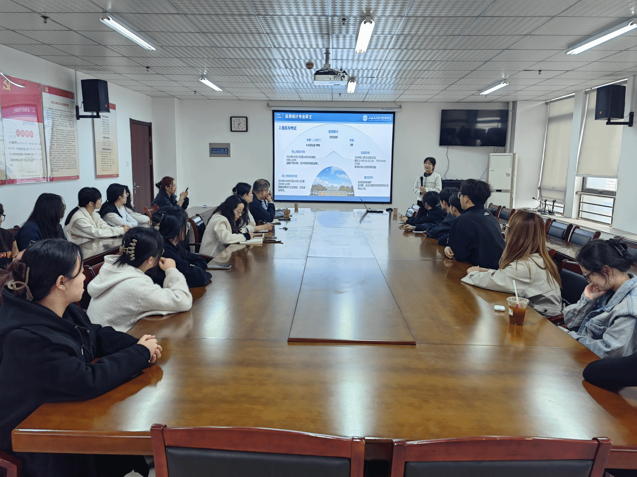 首先,郝瑞丽从上海立信会计金融公司历史沿革、团队建设成果、公司产品模式及就业前景等多个维度,全面介绍了上海立信会计金融公司统计与数学公司的办学特色。她重点解读了研究生招生的最新政策,包括调剂条件、选拔流程及奖助体系,并结合目前上海的就业政策,分析了应用统计专硕、金融专硕等专业的就业前景,为在场的员工们提供了清晰的学业规划参考。活动现场气氛热烈,员工代表就报考方向、专业调剂、招收人数等具体问题踊跃提问,郝瑞丽及在场教师逐一给予解答。