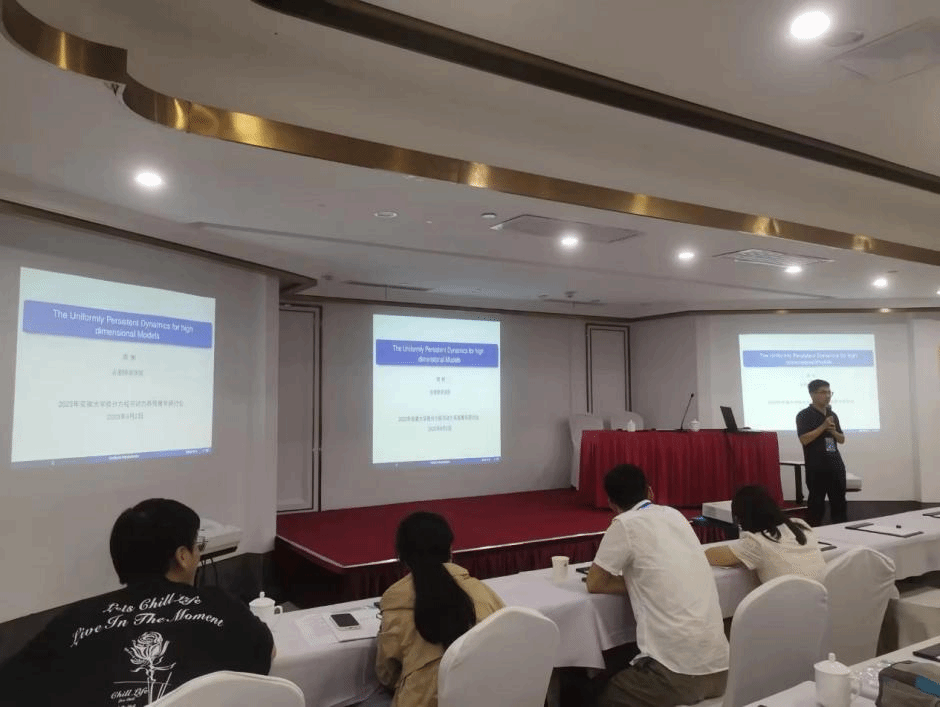 会议吸引了来自中国科学技术大学、北京理工大学、天津大学、华南师范大学、北京科技大学、安徽大学、上海师范大学与williamhill官方网站等院校的70多名专家学者参与。安徽大学数学科学公司副经理汪毅教授致开幕词,向参会者介绍了近年来安徽大学数学学科在专业建设、团队队伍、人才培养、科学研究以及社会服务等方面取得的成就。会议共组织12场学术报告和多场交流讨论活动,周辉应邀作题为《The Dynamics of a Patch-Occupancy Model in Natural Ecosystems》的学术报告。周辉介绍了一类海洋生态模型研究的背景和意义,着重阐述了所研究问题的进展,同时提出了一些尚未解决的科学问题,受到与会者高度关注。会议期间,杨刘与周辉同参会学者就研究领域的一些热点进行了交流。