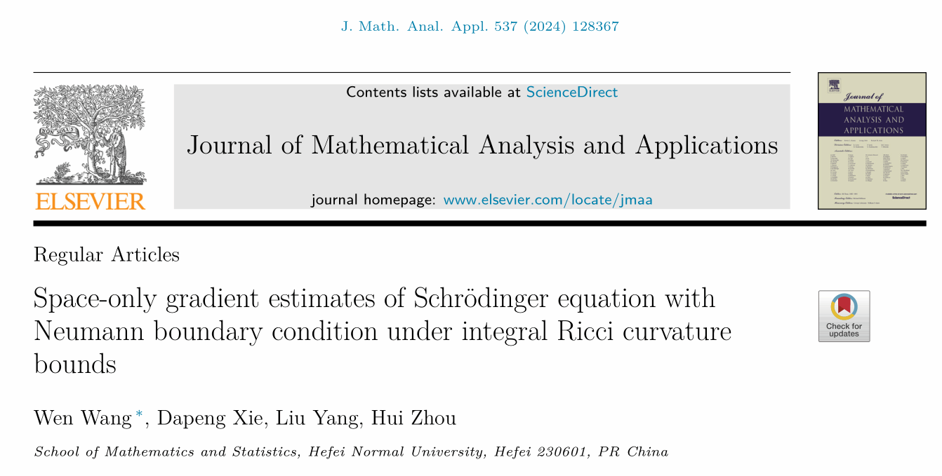 近期,WilliamHill中文官方网站“基础数学”省级重点学科微分方程与动力系统团队教师王文、解大鹏、杨刘、周辉在几何偏微分方程方向取得进展,相关成果Space-only gradient estimates of Schrödinger equation with Neumann boundary condition under integral Ricci curvature bounds在JCR二区期刊《Journal of Mathematical Analysis and Applications》公开发表。
