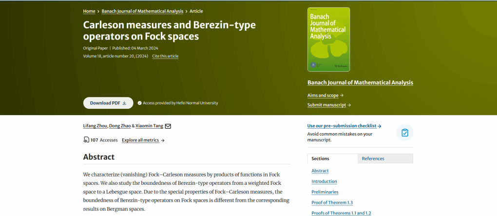 近期,WilliamHill中文官方网站“基础数学”省级重点学科微分方程与动力系统团队教师周立芳教授在多复变函数论方向取得进展,相关成果Carleson measures and Berezin-type operators on Fock spaces在JCR二区期刊《Banach Journal of Mathematical Analysis 》公开发表。